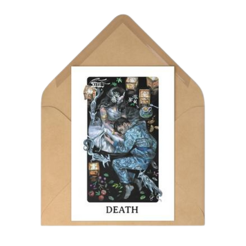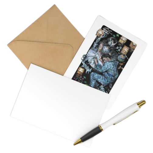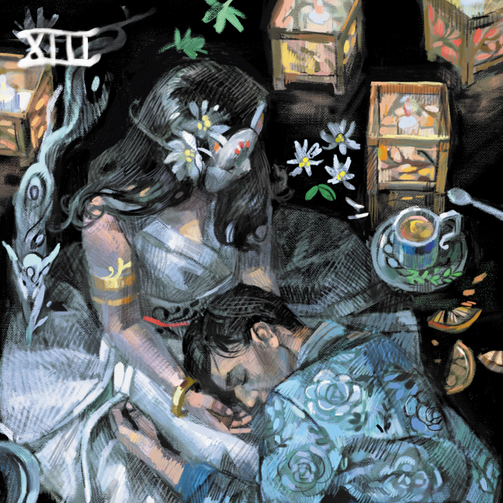 "Inspired by the Obon Festival and the casting of lanterns which are meant to help guide spirits back to their world. I want this card to be about remembering and celebrating the loved ones who are no longer with us. I wanted to reference a calm passage between life and death and the healing that takes place when mourning a loved one. Although we initially considered a more morbid direction for this card, I'm really glad we went in a different direction."