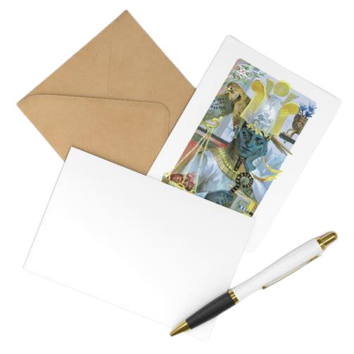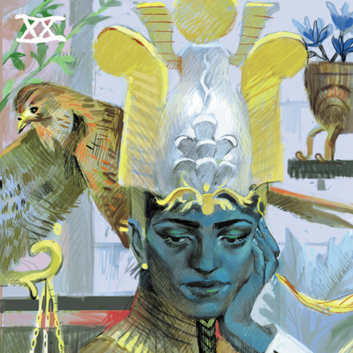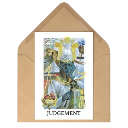 "The Judgment of Osiris. The card is depicting the weighing of the heart as a means to judge the dead in the afterlife. I tried to keep the figure as accurate to the historical depictions as possible. I wanted this card to ask questions about one’s personal process of evaluation and what one considers important values to themselves and why."