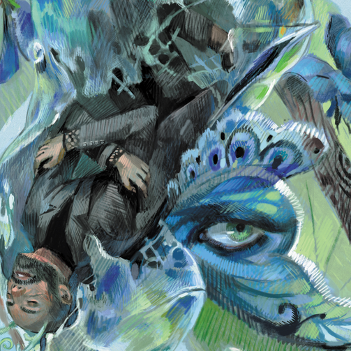 "Inspired by Jarius Khan. I wanted this card to be about changes and the many transformations people go through over time as they experiment with themselves and the world around them. I really loved the cocoon suggestion by Audra so I went with it! I knew before I started that this was going to be Jarius in the middle of emerging so as to capture the moment of the reveal. I included elements of Jarius's style both current and past. I drew his eye on the wings to represent different ways of seeing."