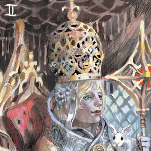 To me this card is about trusting one's own instincts, body, and ambitions as well as a celebration of the complex lives/thoughts/feelings we all have. I've also included rabbits as a symbol of cleverness and luck."