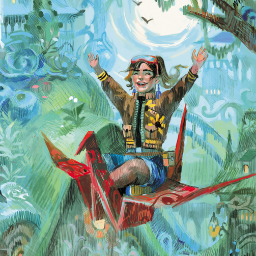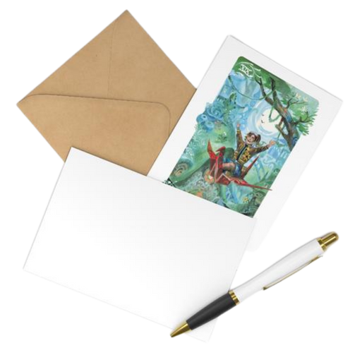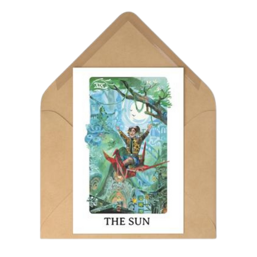 "Inspired by Jennifer E. Crawford. This card aims to interpret the Sun as the provider of life which is why I decided to make the setting a forested city that is lush and full of plants and growth. I also wanted to create an atmosphere full of whimsy and joy which is both what I feel this card represents and inspired by what I experience when I look at Jennifer's culinary creations."