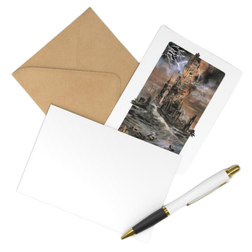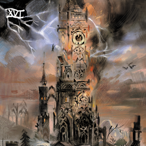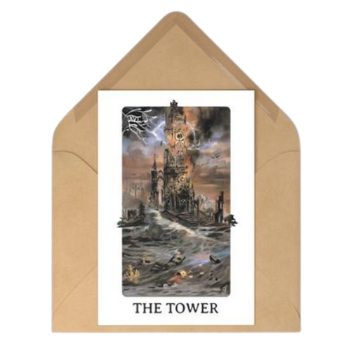 "I wanted this card to be somewhat ominous and foreboding. The scene is one of a moody night with wind and harsh waves, as if everything is coming together to strike at the tower. The lightning is shaped like an eye to represent coming to terms with the truth or fully seeing the situation. The trees are a sign that although there is presently chaos, there can also be rebuilding and regrowth.